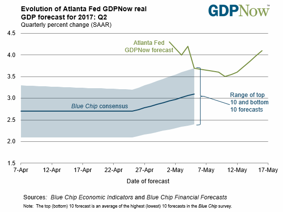 Inflation has been trending at roughly 2%; GDP growth which was disappointing for Q1 2017 is due for a big pick up in Q2 per the Atlanta’s Fed GDP Now’s forecasting model which is estimating as of May 16, a 4.1% annual rate. We’ll be monitoring at Real Investment Advice as this model is updated six or seven times a month with at least one update following seven economic data revisions from the BEA.
