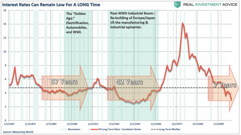 No doubt interest rates can remain low for extremely long spans. Several prolonged periods are mind boggling to comprehend as outlined in this chart from Lance Roberts.