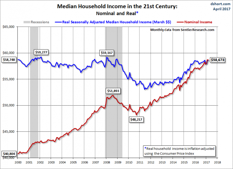 Adjusted for inflation which is most important, median household real income peaked at the beginning of the Great Recession. Sadly, inflation-adjusted income is still .7% below the beginning of the year 2000.
