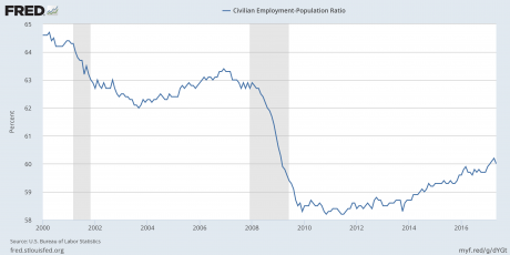 Another way to look at this is by examining the civilian employment-population ratio. Just before the last recession, about 63 percent of the working age population had a job, but then during the recession that number fell to between 58 and 59 percent for quite a while. We have finally gotten back to the 60 percent mark, but we are still far, far below the level that we were at before the last recession struck.